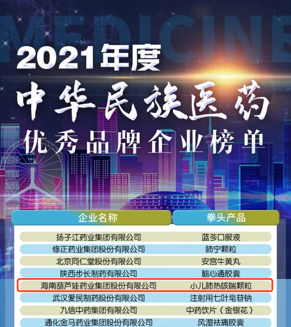 12月29日,全国工商联医药业商会发布了“2021年度中华民族医药优秀品牌企业榜单”,尊龙凯时药业集团凭借黄金单品小儿肺热咳喘颗粒(4克)实力登榜。